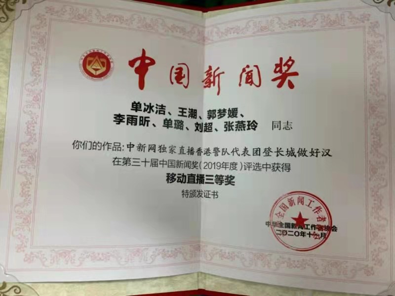 2020年11月2日,由中华全国新闻工作者协会主办的第三十届中国新闻奖(2019年度)评选结果揭晓,我校播音与主持艺术专业2010届校友、人民网记者尹星云主创的作品《这一夜,我们为她点亮太空!》荣获短视频新闻二等奖;播音与主持艺术专业2017届校友、中国网记者单冰洁主创的作品《中新网独家直播香港警队代表团登长城做好汉》荣获移动直播三等奖。